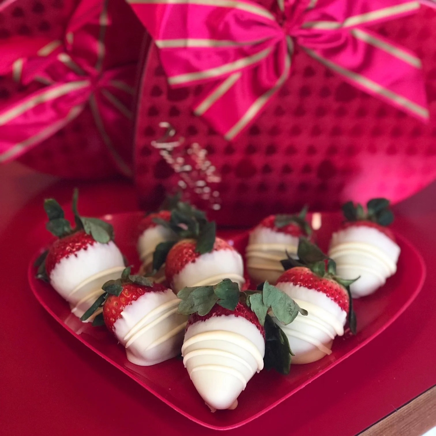 This rectangular gift box includes a baker’s dozen (13) dipped strawberries. (We also have 1/2 dozen (6) available.)
